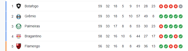 Em crise técnica e tática, o Botafogo ainda lidera e só depende de si para ser campeão. Os cariocas que devem trocar de treinador durante a Data Fifa tem seis jogos - um atrasado contra o Fortaleza - e lideram com 59 pontos. No final de semana, o Fogão enfrenta o Red Bull Bragantino, fora de casa, e precisam vencer para não depender de resultados paralelos. O Grêmio torce pelo empate para "travar" ambos os times.