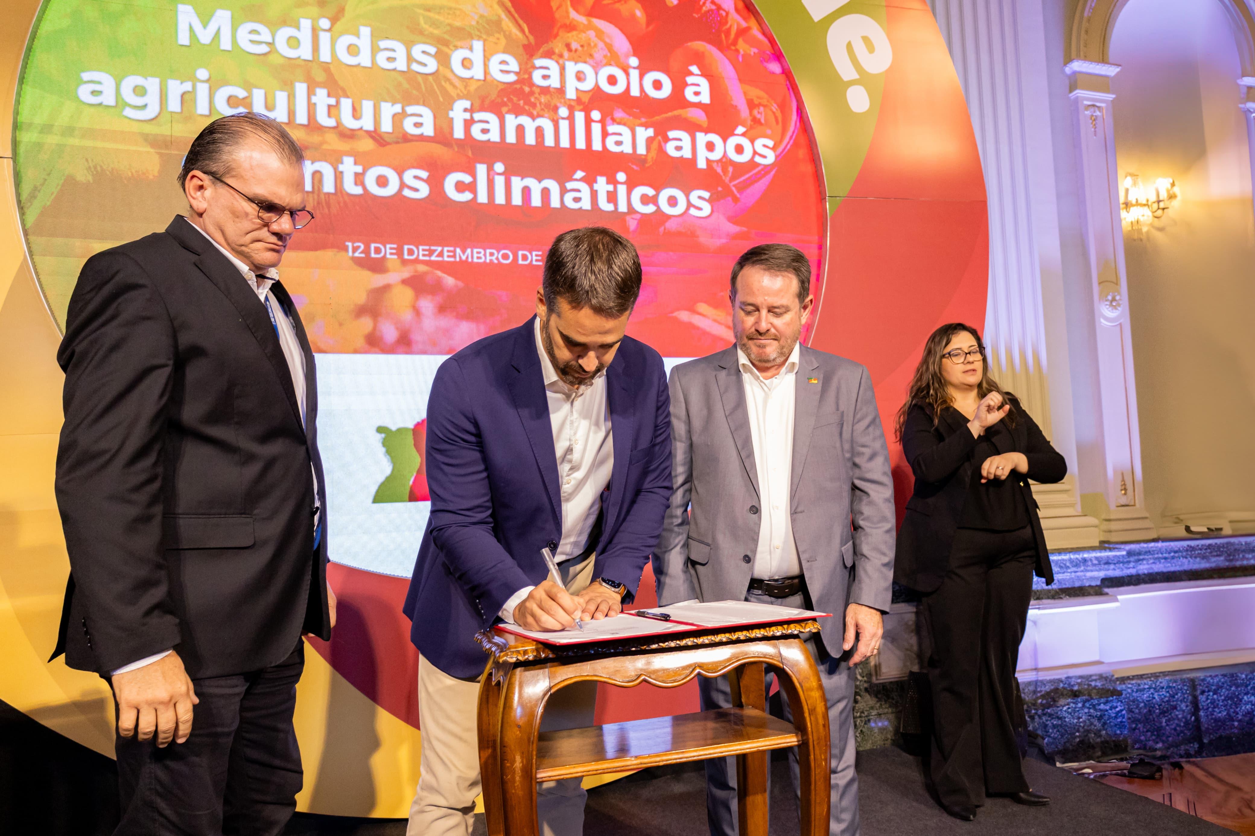 O governo do Estado lançou nesta terça-feira o programa Reconstrói no Campo e assinou convênios da primeira fase do Programa de Recuperação da Fertilidade do Solo, iniciativas que devem aplicar R$ 69 milhões na agricultura familiar em municípios atingidos por catástrofes climáticas este ano. A cerimônia ocorreu no Palácio Piratini, em Porto Alegre, e contou com a presença do governador Eduardo Leite e do secretário de Desenvolvimento Rural, Ronaldo Santini.