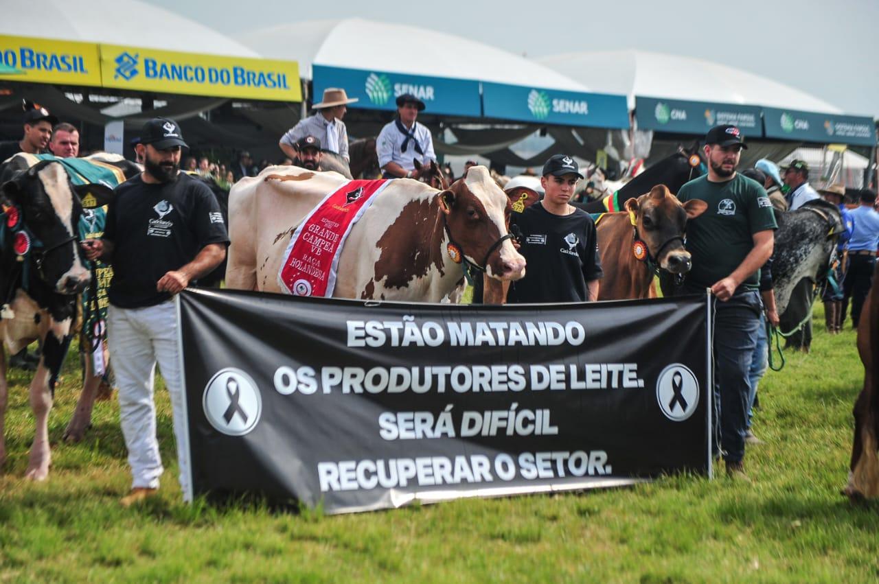 “Estamos vindo de uma situação muito difícil na agricultura do Rio Grande do Sul. Em algumas regiões, viemos de três estiagens. Na última safra, tivemos uma conjunção muito ruim para o produtor. A primeira é que fizemos a safra mais cara da história do país. Em segundo, foi a menor safra, com quebra para alguns produtores por causa da estiagem. Em terceiro, os preços dos produtos desandaram. Os produtores rurais estão dando demonstração de que são a saída para o país e o mundo. Eles vieram dessa conjunção de problemas e estão batendo recorde na feira, porque eles têm visão, acreditam no futuro e estão fazendo a parte deles. Eles esperam dos governos estadual e federal apenas duas coisas: que os ampare e os ajude para que continuem gerando riqueza para o país. Os produtores de leite estão com uma faixa (foto acima), acho que não deu para você enxergar, mas nossos produtores de leite estão morrendo. Tínhamos 84 mil famílias produtoras de leite e hoje temos 33 mil produtores no Estado. Mais de 60% das famílias produtoras de leite saíram da atividade porque não conseguem ser competitivas. Não tem aqui nenhum demérito para os produtores do Uruguai e da Argentina. Queremos só as mesmas condições que eles têm lá para competirmos e continuarmos a produzir. Agradecemos as ações do governo federal, mas elas são insuficientes. Nossos problemas não estão em alguns tipos de queijo ou manteiga que vêm da União Europeia. Eles estão no leite em pó do Mercosul que está entrando aqui por R$ 6 a menos. Precisamos de ações, e elas têm que ser imediatas. Comprar leite é importantíssimo, mas é insuficiente, porque vamos enxugar gelo. Vamos ajudar as cooperativas, mas não vai ajudar o produtor, porque as fronteiras estão abertas. Precisamos criar cotas ou subsidiar os produtores daqui do Brasil como a Argentina fez por quatro meses. Também temos que ver a questão do Proagro, que vai deixar milhares de famílias de fora.”