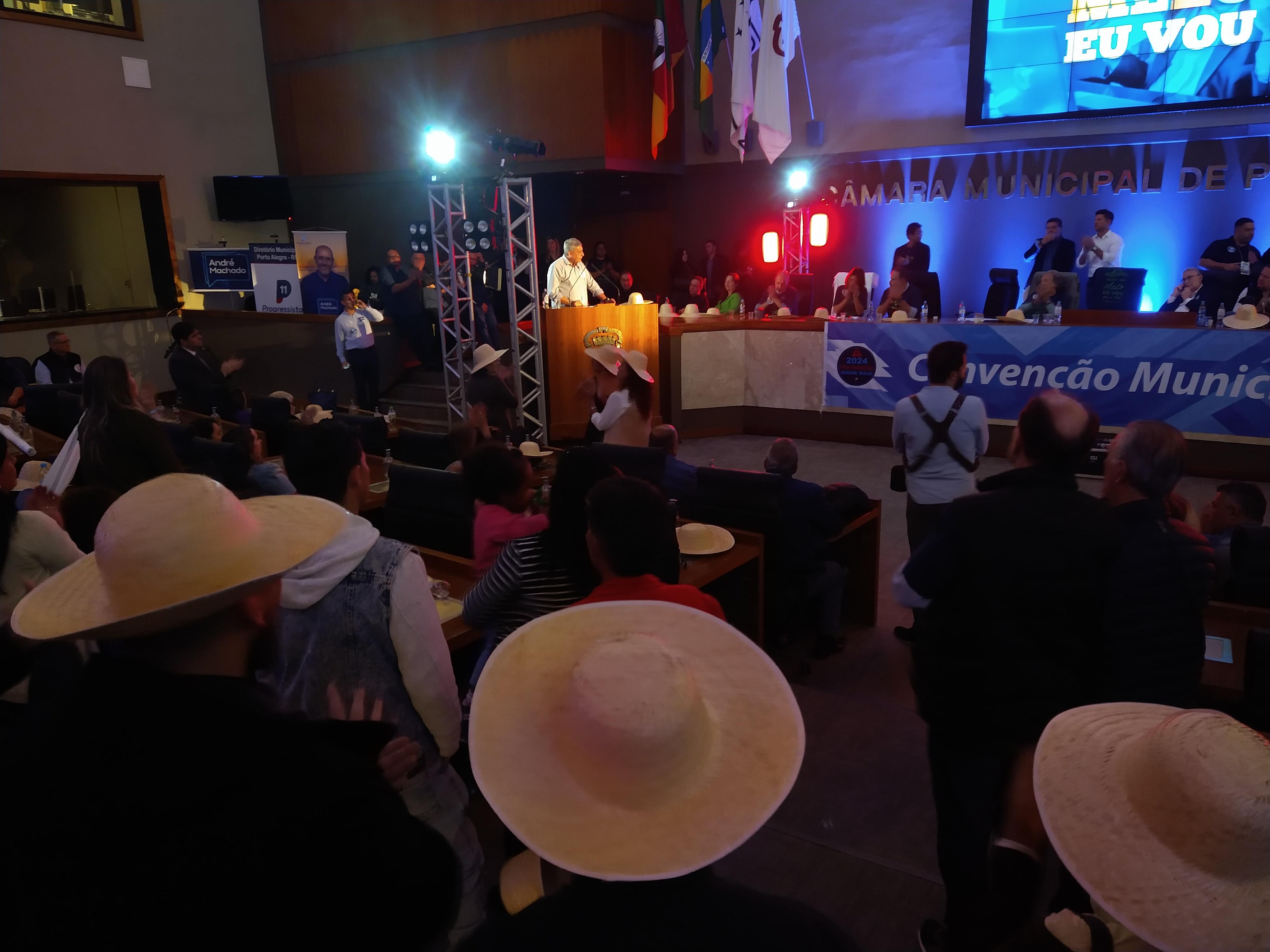 Em um evento prestigiado por lideranças, deputados federais e estaduais, o PP de Porto Alegre realizou convenção na manhã deste sábado, na Câmara de Vereadores da Capital. Além de reconduzir por aclamação Vitor Alcântara, o Vitinho, como presidente municipal, o ato, em clima festivo, serviu principalmente para endossar o apoio a reeleição de Sebastião Melo (MDB). Essa aliança, foi, inclusive, materializada em símbolos.