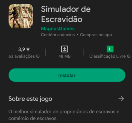O lançamento de um aplicativo que simula a compra e venda de pessoas negras escravizadas gerou revolta e muitas críticas nas redes sociais nesta quarta-feira. O aplicativo chamado “Simulação de Escravidão” é uma versão interativa que permite a compra e venda de escravizados e incentiva o usuário ao acúmulo de dinheiro às custas da exploração dessas pessoas. O aplicativo foi criado pela Magnus Games e disponibilizado na Google Play Store, no dia 20 de abril, com classificação livre. Com a repercussão, o aplicativo foi retirado na tarde de hoje da loja Play Store, onde estava disponibilizado.