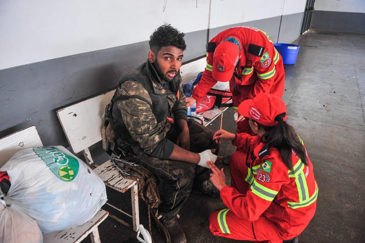 Dentro do ginásio do Centro de Referência de Assistência Social (Cras) onde estão abrigadas oito famílias, um voluntário com roupas camufladas recebia atendimento médico. Ele foi mordido por um cachorro ao resgatá-lo do telhado de uma casa. Hoje trabalhador da construção civil em Roca Sales, Jader Marcelo Vieira, de 27 anos, já atuou no Exército. “Como eu tenho treinamento militar é meu dever ajudar”, afirmou.