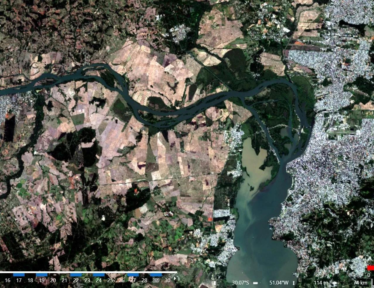 Com as imagens obtidas pela MetSul Meteorologia junto ao Sistema Copernicus da União Europeia, é possível perceber a diferença do Guaíba antes e depois das cheias