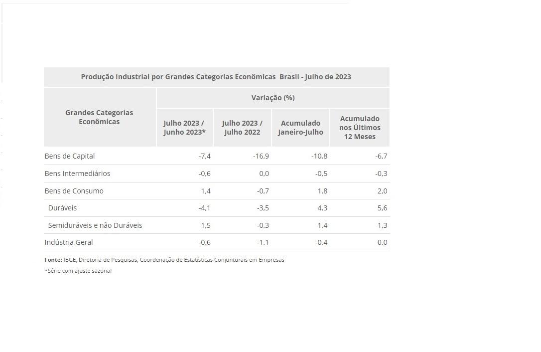 Três das quatro grandes categorias econômicas obtiveram queda, com bens de capital (-7,4%) e bens de consumo duráveis (-4,1%) com as taxas negativas mais acentuadas em julho de 2023, ambas acumulando perda de 9,5% em dois meses consecutivos de queda na produção, em comparação ao mês de junho.