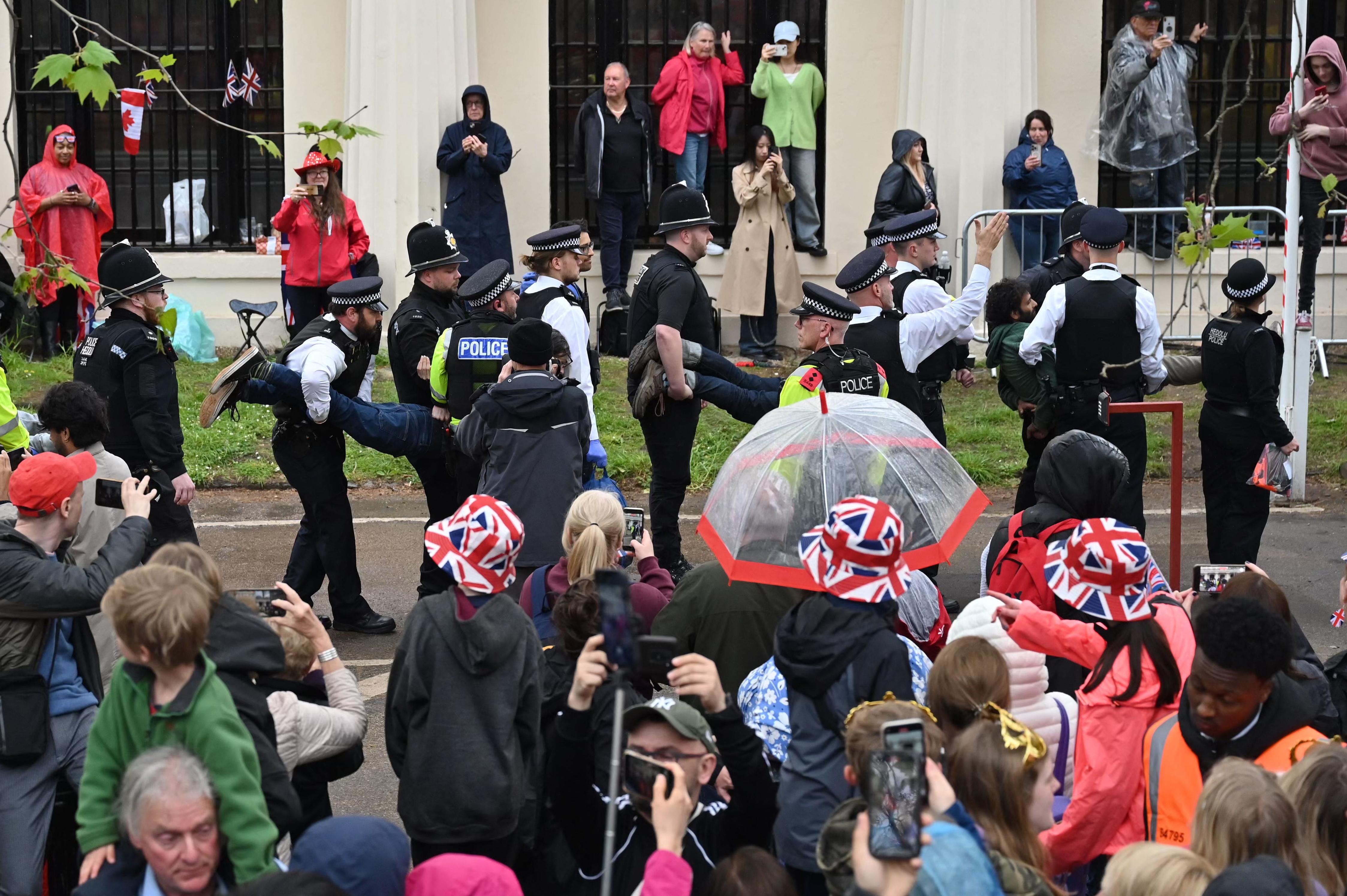 A convivência foi cordial entre os manifestantes e o restante da multidão até que, na aproximação do cortejo real, os apoiadores da monarquia vaiaram aqueles que gritavam "Não é meu rei!" e "Abaixo a coroa!". Em seguida, começaram a cantar o hino nacional, "God Save The King", enquanto agitavam bandeiras britânicas.