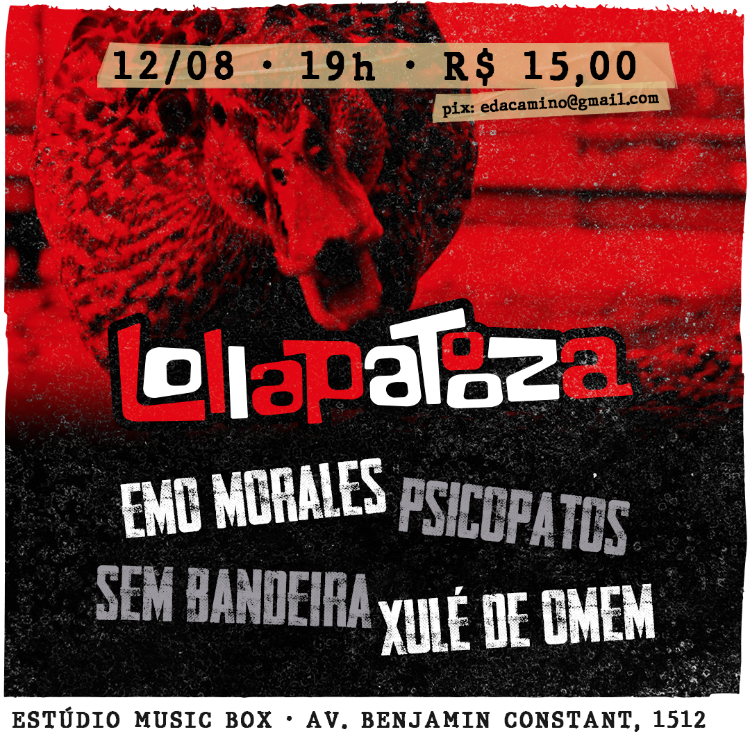 Neste sábado, dia 12 de agosto, será realizado o Primeiro Festival LollaPatooza, organizado pela banda Psicopatos. Quatro bandas da cena Underground Gaúcha, Xulé de Omem, Emo Morales, Sem Bandeira e Psicopatos, estarão se apresentando no palco do Music Box, na Avenida Benjamin Constant, 1512, a partir das 19h. Os ingressos, R$15,00, podem ser adquiridos via Pix, pela chave e-mail edacamino@gmail.com.