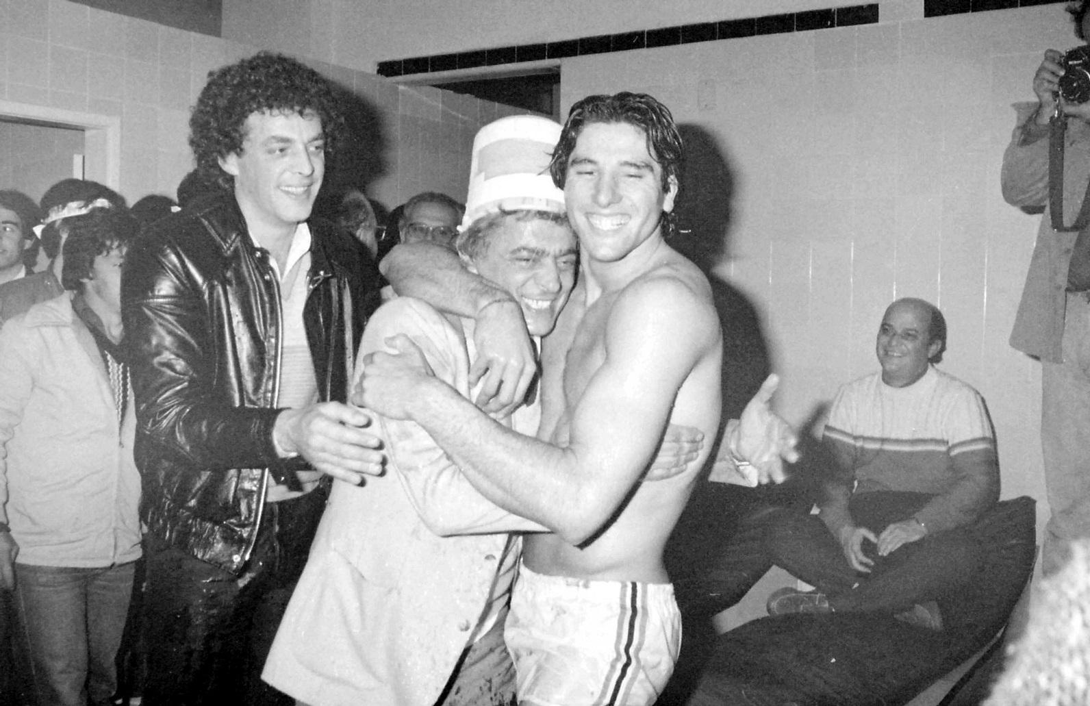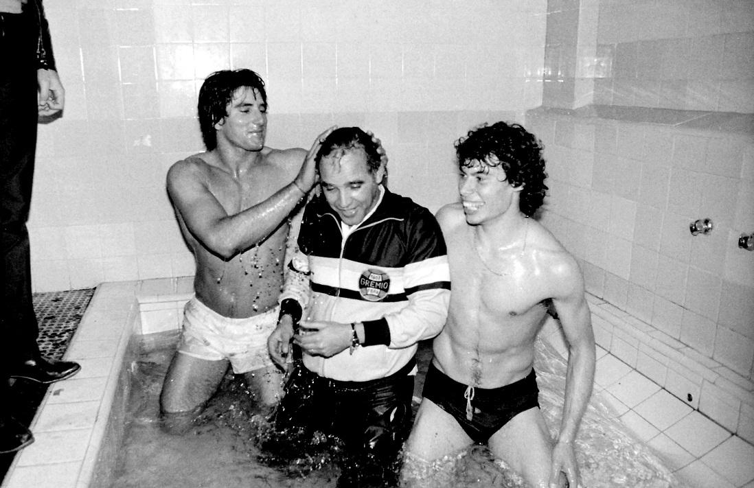 Renato e o lateral-direito Paulo Roberto com o técnico Valdir Espinosa na banheira do vestiário do Olímpico / CP Memória