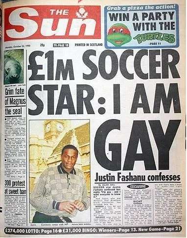 Já nesta época, ele começou a ter problemas fora de campo. Passou por muitos clubes da Inglaterra e até dos Estados Unidos, já sem o mesmo sucesso. Até que, em 1990, Fashanu assumiu sua homossexualidade em entrevista ao The Sun. Na capa, o tabloide estampou “I AM GAY” (Eu sou gay) em letras garrafais, confirmando uma série de boatos que acompanharam a carreira do jogador.