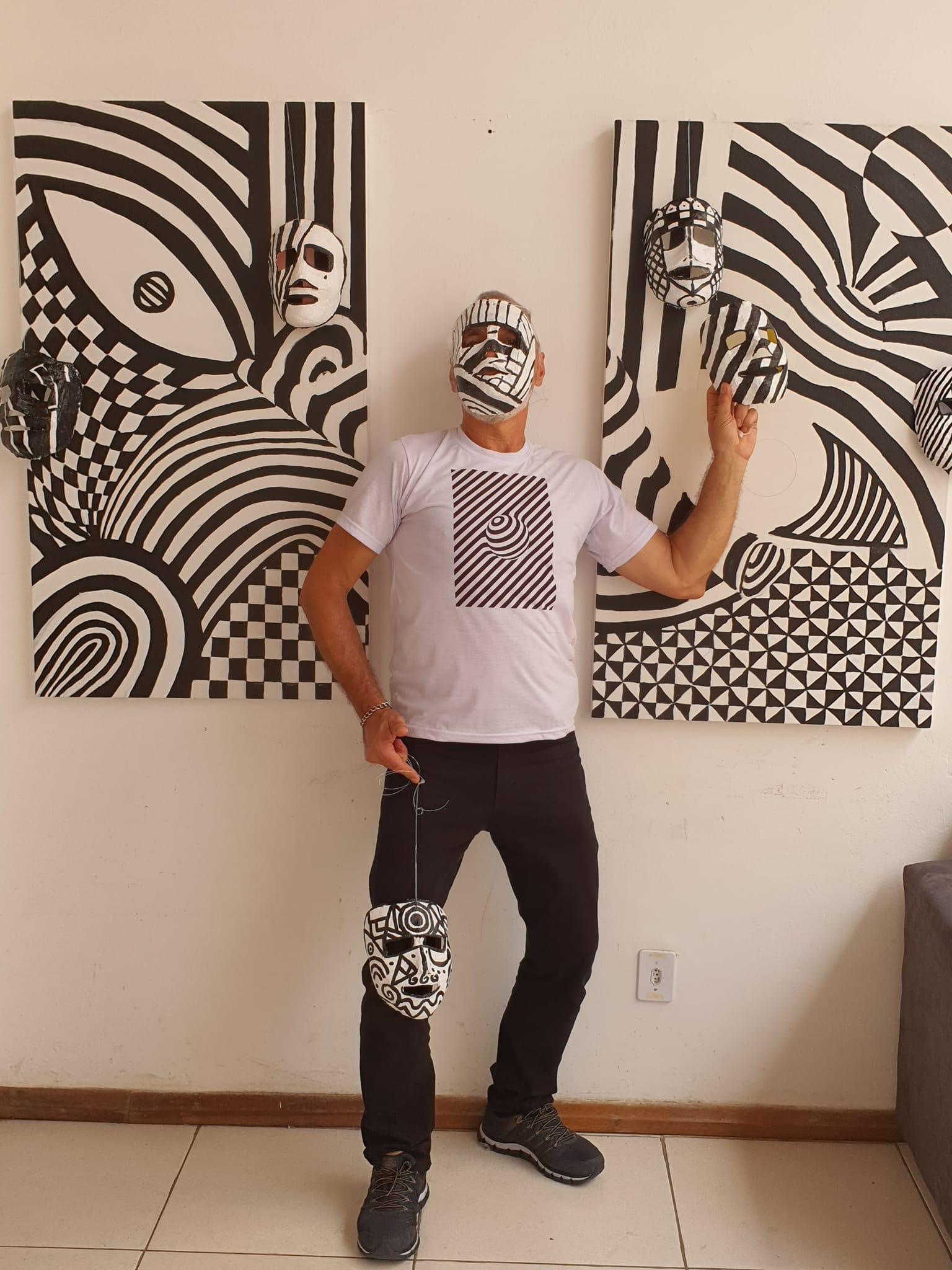 Aloizio Pedersen com pinturas e máscaras realizadas em oficina anterior. Crédito: Arquivo Pessoal / Divulgação