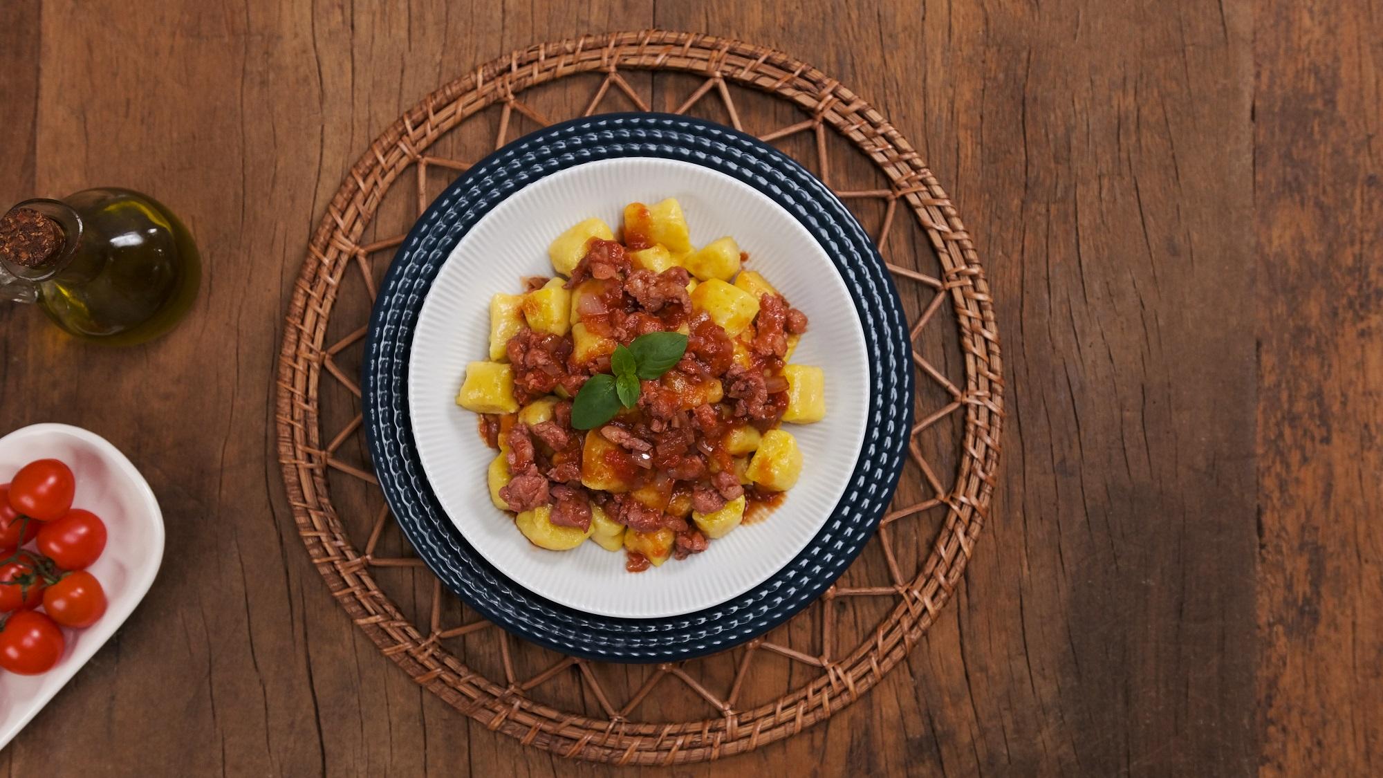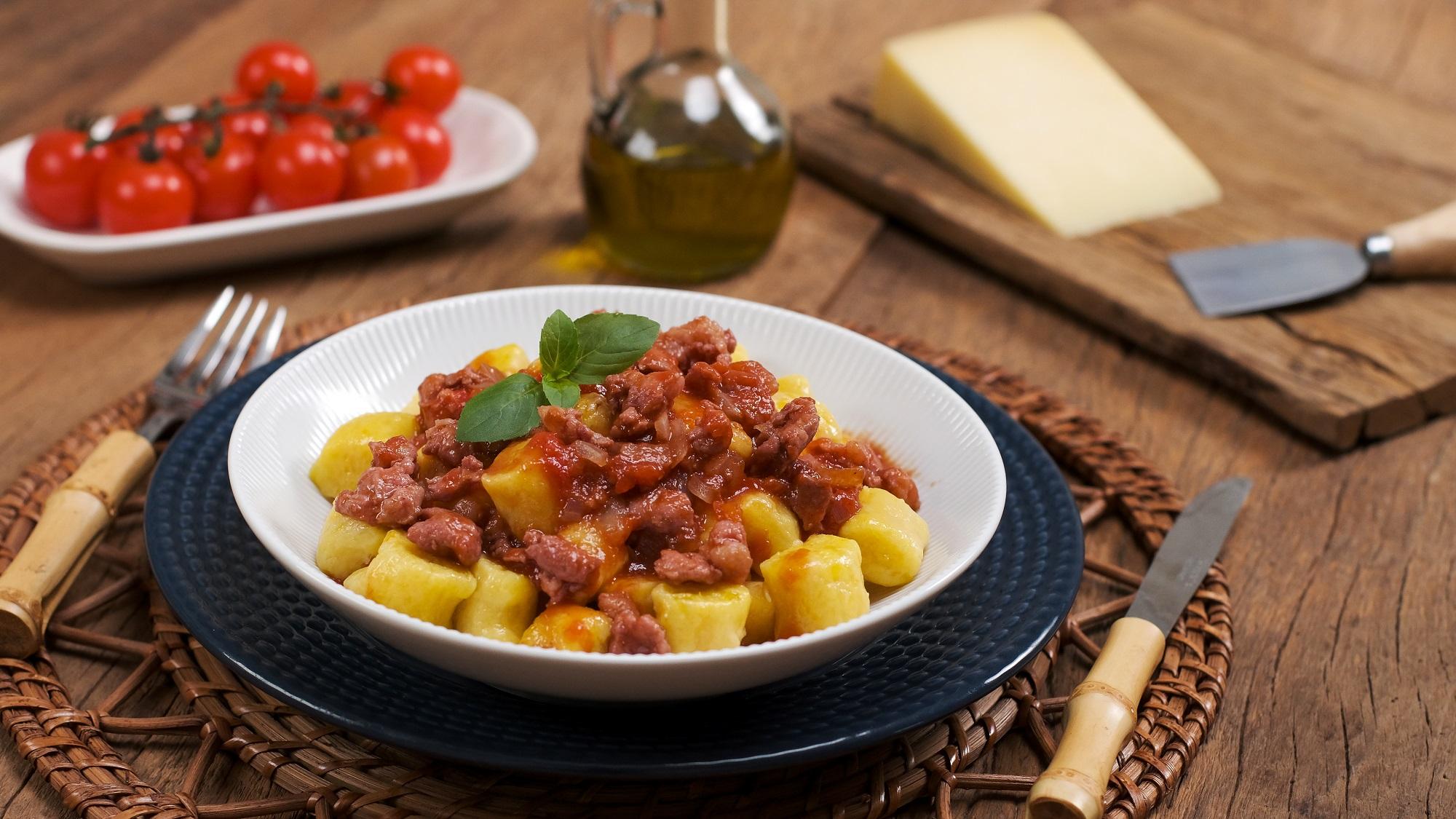 Comece preparando o nhoque misturando todos os ingredientes. Depois polvilhe a mesa com farinha e faça rolinhos com a massa. Corte em pequenos pedaços e cozinhe em água fervente até eles subirem para a superfície. Escorra e coloque em um refratário. Reserve. Na panela, coloque o azeite e a linguiça e deixe dourar. Junte a cebola e acrescente o vinho. Deixe ferver. Coloque o tomate, tempere com sal. Refogue por mais 5 minutos. Sirva junto com o nhoque.