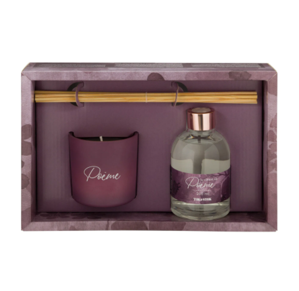 O Kit Poème, da Tok & Stok inclui não só um difusor, mas também uma vela aromática, com um aconchegante e suave aroma de pétalas que transforma a atmosfera do ambiente. Preço sugerido: R$ 205,90